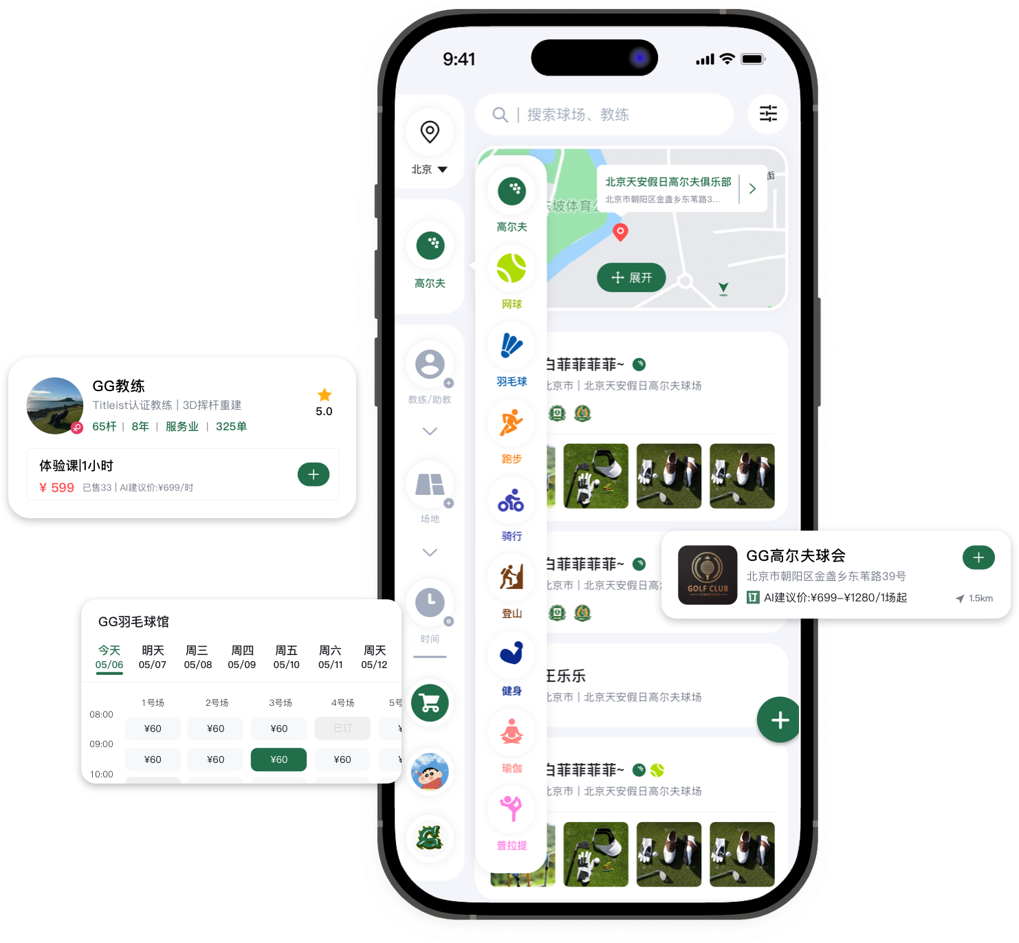 在GG App是一款全场景运动生活服务平台,整合高尔夫、网球、羽毛球、骑行、跑步、登山、健身、瑜伽、普拉提等多项运动,提供智能场地预约、专业教练匹配、约球搭子组队、社交动态分享及穿搭种草等功能;